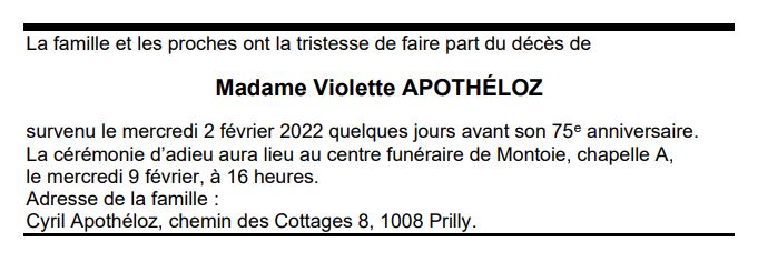 Madame Violette APOTHÉLOZ 27 fév. 1947 - 02 fév. 2022 Avis mortuaire PFG Télecharger PDF Partager sur: Galerie PreviousNext PreviousNext