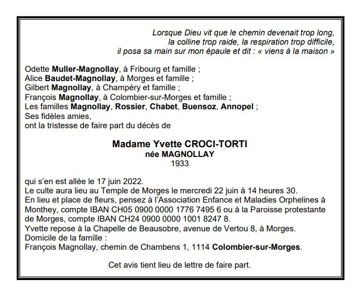 Madame Yvette CROCI-TORTI 05 fév. 1933 - 17 juin. 2022 Avis mortuaire PFG Télecharger PDF Partager sur: Galerie PreviousNext PreviousNext