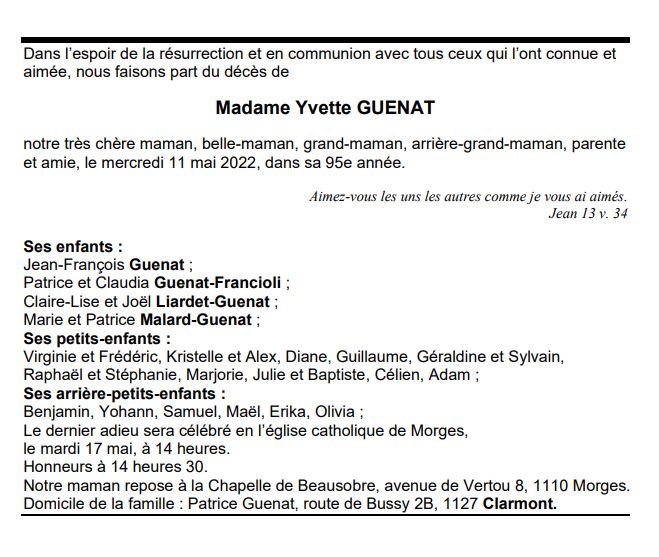 Madame Yvette GUENAT 12 aoû. 1927 - 11 mai. 2022 Avis mortuaire PFG Télecharger PDF Partager sur: Galerie PreviousNext PreviousNext