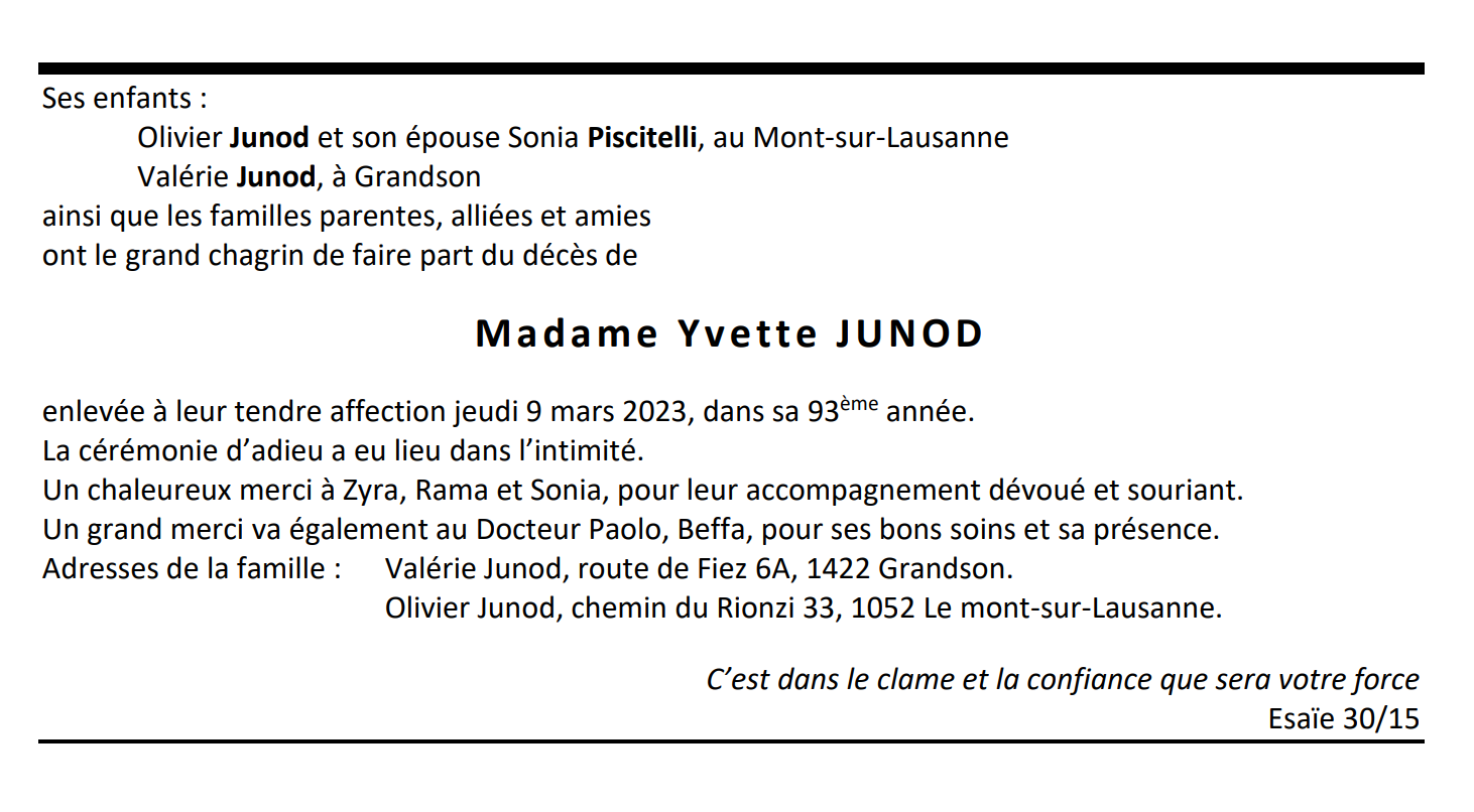 Madame Yvette JUNOD 29 nov. 1930 - 09 mar. 2023 Avis mortuaire PFG Télecharger PDF Partager sur: Galerie PreviousNext PreviousNext
