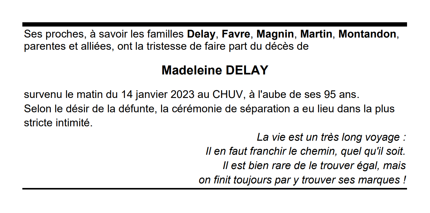 Madeleine DELAY 20 jan. 1928 - 14 jan. 2023 Avis mortuaire PFG Télecharger PDF Partager sur: Galerie PreviousNext PreviousNext