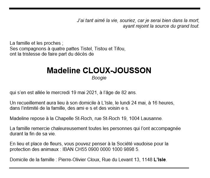 Madeline CLOUX-JOUSSON 10 mai. 1939 - 19 mai. 2021 Avis mortuaire PFG Télecharger PDF Partager sur: Galerie PreviousNext PreviousNext