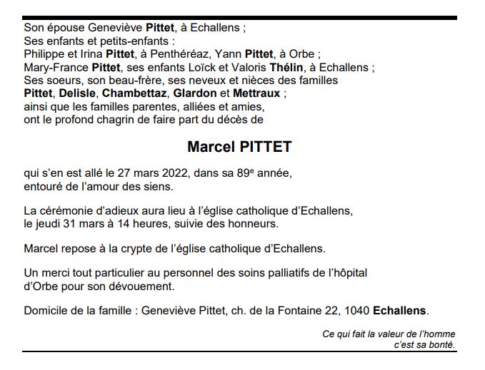 Marcel PITTET 09 sep. 1933 - 27 mar. 2022 Avis mortuaire PFG Télecharger PDF Partager sur: Galerie PreviousNext PreviousNext