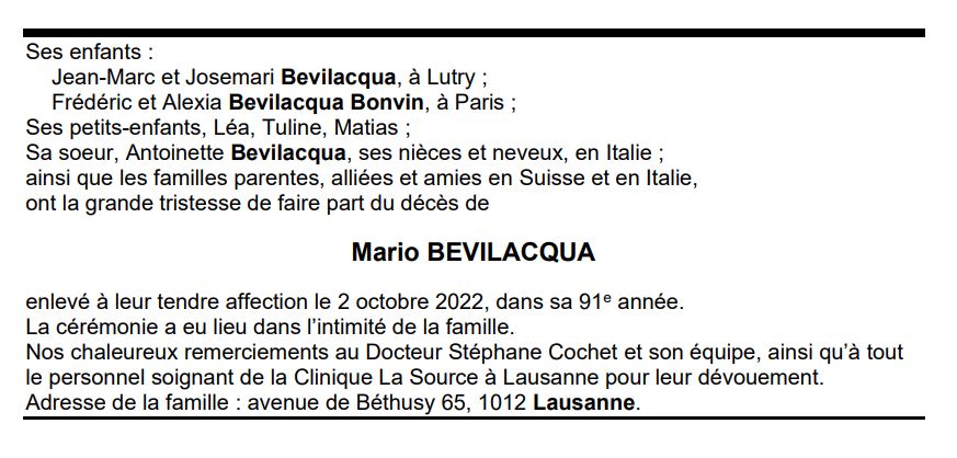 Mario BEVILACQUA 04 juil. 1932 - 02 oct. 2022 Avis mortuaire PFG Télecharger PDF Partager sur: Galerie PreviousNext PreviousNext