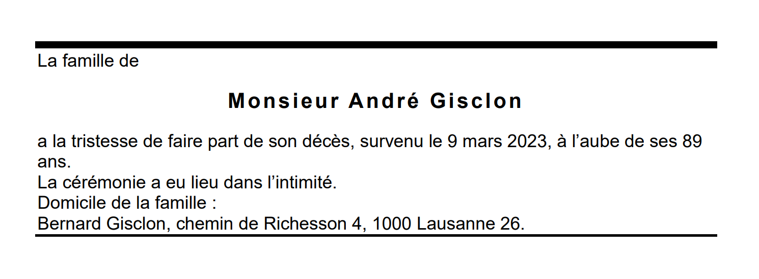 Monsieur André Gisclon 17 avr. 1934 - 09 mar. 2023 Avis mortuaire PFG Télecharger PDF Partager sur: Galerie PreviousNext PreviousNext