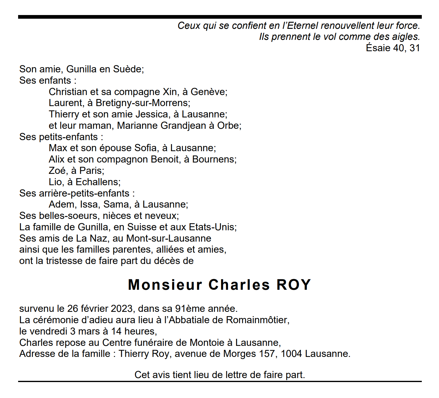 Monsieur Charles ROY 21 nov. 1932 - 26 fév. 2023 Avis mortuaire PFG Télecharger PDF Partager sur: Galerie PreviousNext PreviousNext