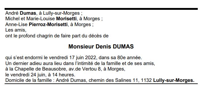 Monsieur Denis DUMAS 11 mar. 1943 - 17 juin. 2022 Avis mortuaire PFG Télecharger PDF Partager sur: Galerie PreviousNext PreviousNext