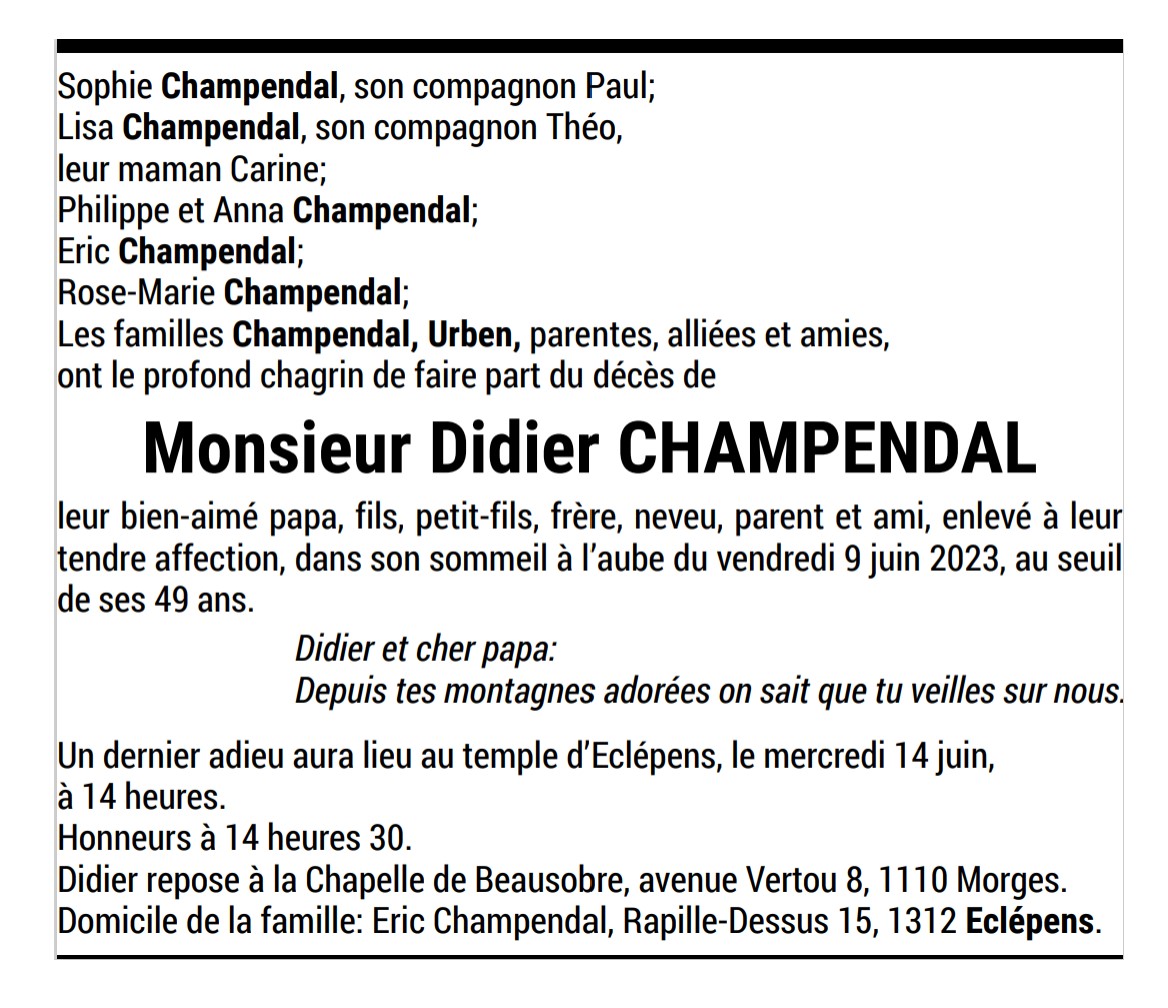 Monsieur Didier CHAMPENDAL 28 aoû. 1974 - 09 juin. 2023 Avis mortuaire PFG Télecharger PDF Partager sur: Galerie PreviousNext PreviousNext