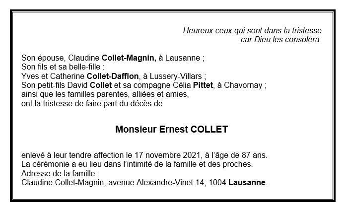 Monsieur Ernest COLLET 21 fév. 1934 - 17 nov. 2021 Avis mortuaire PFG Télecharger PDF Partager sur: Galerie PreviousNext PreviousNext