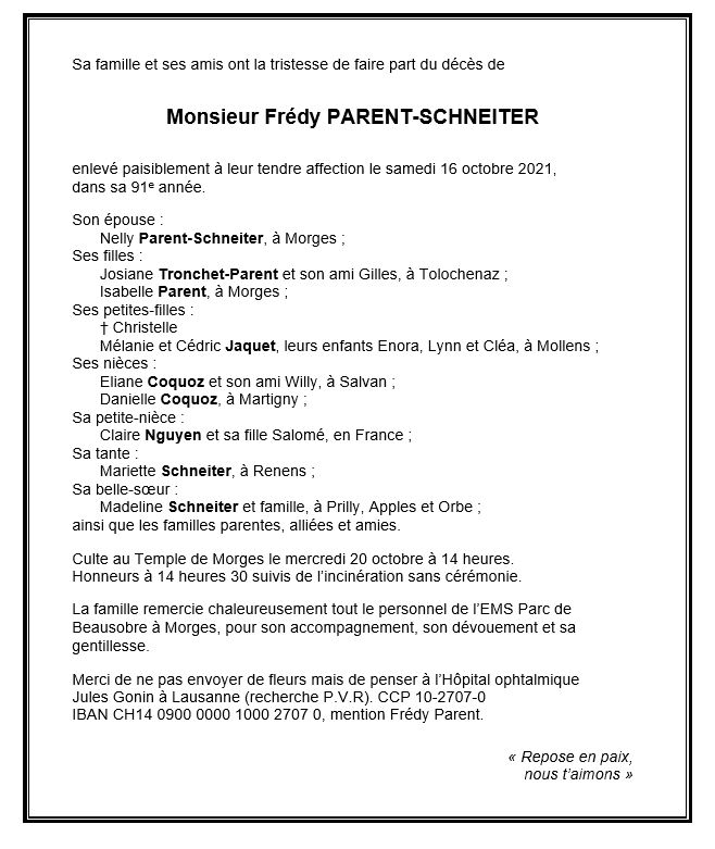 Monsieur Frédy PARENT-SCHNEITER 29 juil. 1931 - 16 oct. 2021 Avis mortuaire PFG Télecharger PDF Partager sur: Galerie PreviousNext PreviousNext