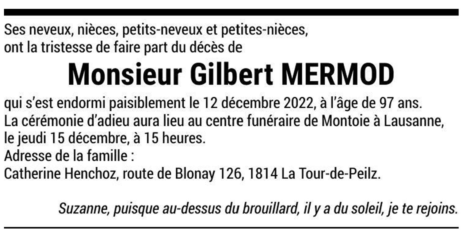 Monsieur Gilbert MERMOD 25 nov. 1925 - 12 déc. 2022 Avis mortuaire PFG Télecharger PDF Partager sur: Galerie PreviousNext PreviousNext