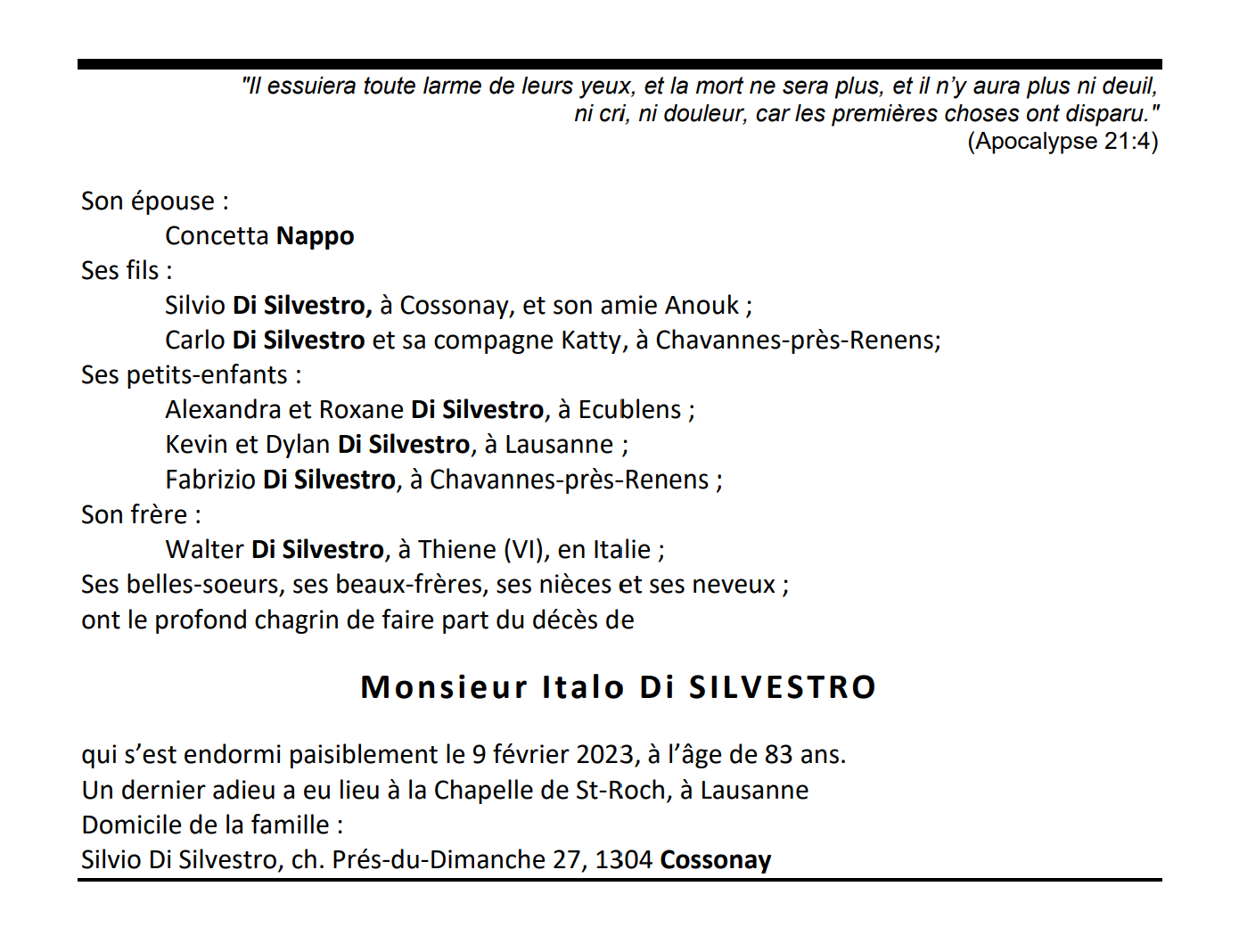 Monsieur Italo Di SILVESTRO 06 jan. 1940 - 09 fév. 2023 Avis mortuaire PFG Télecharger PDF Partager sur: Galerie PreviousNext PreviousNext