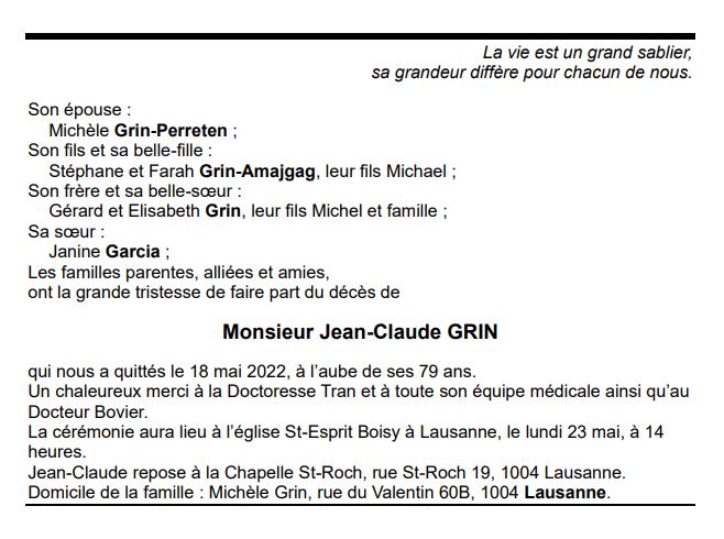 Monsieur Jean-Claude GRIN 21 mai. 1943 - 18 mai. 2022 Avis mortuaire PFG Télecharger PDF Partager sur: Galerie PreviousNext PreviousNext
