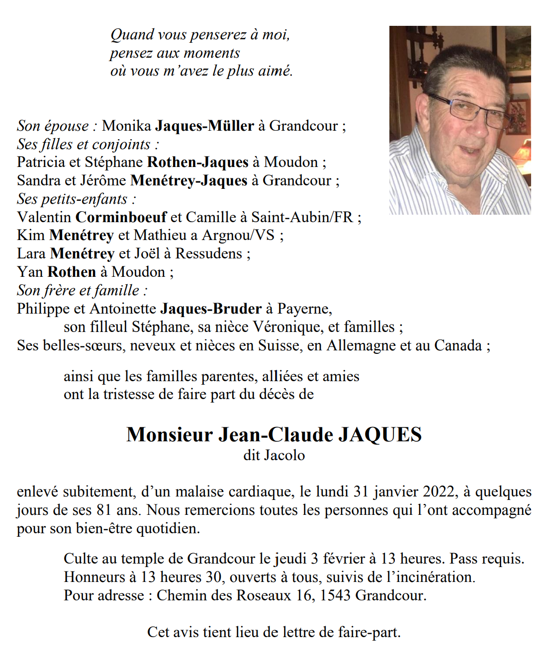 Monsieur Jean-Claude JAQUES 06 fév. 1941 - 31 jan. 2022 Avis mortuaire PFG Télecharger PDF Partager sur: Galerie PreviousNext PreviousNext