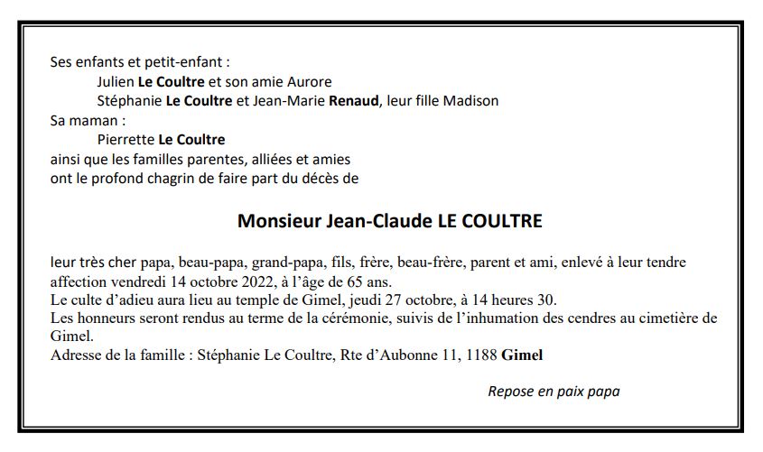 Monsieur Jean-Claude LE COULTRE 24 aoû. 1957 - 14 oct. 2022 Avis mortuaire PFG Télecharger PDF Partager sur: Galerie PreviousNext PreviousNext