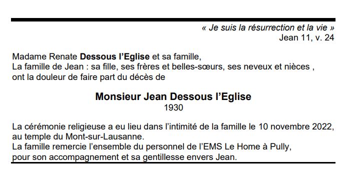Monsieur Jean Dessous l’Eglise 03 déc. 1930 - 05 nov. 2022 Avis mortuaire PFG Télecharger PDF Partager sur: Galerie PreviousNext PreviousNext