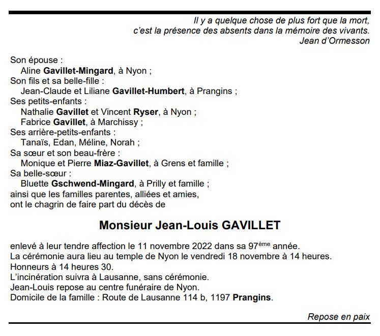 Monsieur Jean-Louis GAVILLET 20 mai. 1926 - 11 nov. 2022 Avis mortuaire PFG Télecharger PDF Partager sur: Galerie PreviousNext PreviousNext
