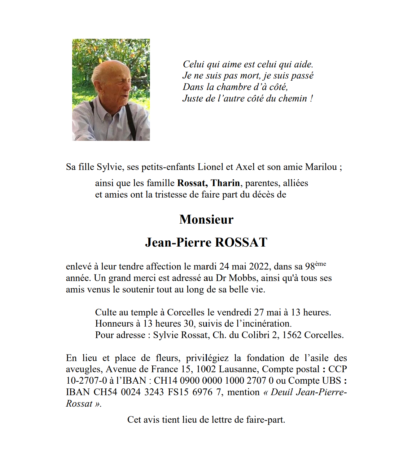 Monsieur Jean-Pierre ROSSAT 06 sep. 1924 - 24 mai. 2022 Avis mortuaire PFG Télecharger PDF Partager sur: Galerie PreviousNext PreviousNext