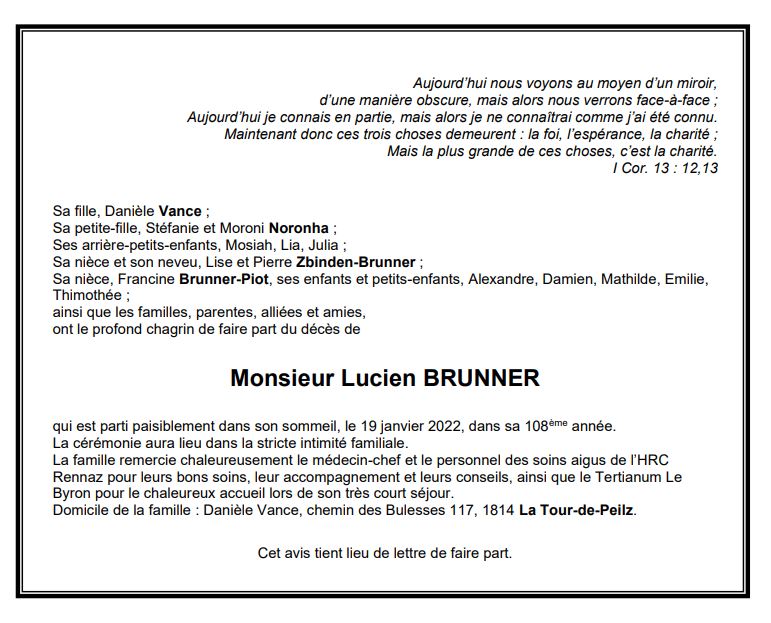 Monsieur Lucien BRUNNER 09 jan. 1915 - 19 jan. 2022 Avis mortuaire PFG Télecharger PDF Partager sur: Galerie PreviousNext PreviousNext