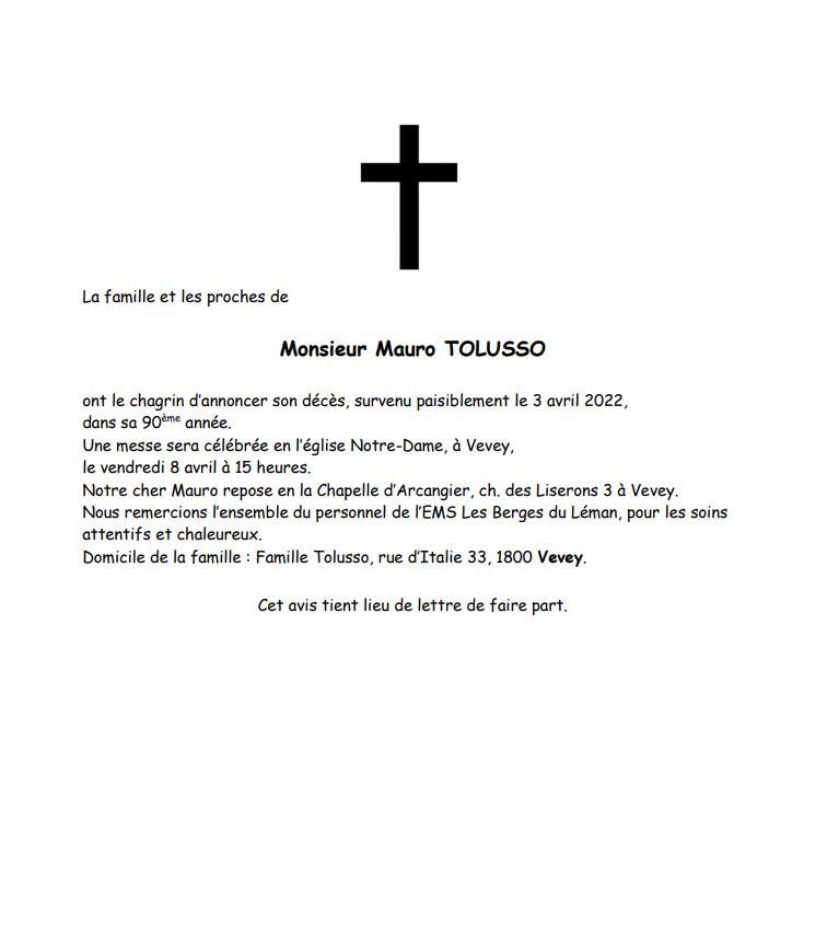 Monsieur Mauro TOLUSSO 21 nov. 1932 - 03 avr. 2022 Avis mortuaire PFG Télecharger PDF Partager sur: Galerie PreviousNext PreviousNext