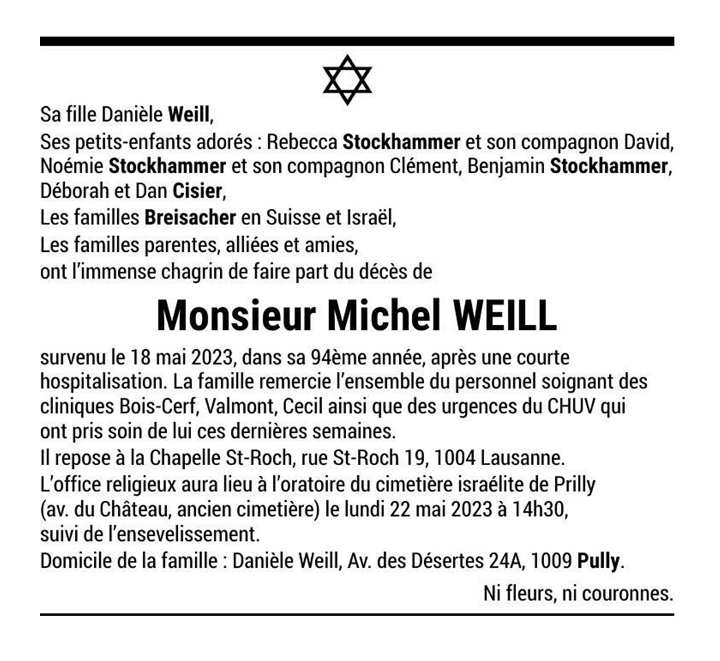 Monsieur Michel WEILL 09 oct. 1929 - 18 mai. 2023 Avis mortuaire PFG Télecharger PDF Partager sur: Galerie PreviousNext PreviousNext