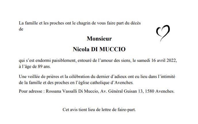 Monsieur Nicola DI MUCCIO 02 avr. 1933 - 16 avr. 2022 Avis mortuaire PFG Télecharger PDF Partager sur: Galerie PreviousNext PreviousNext