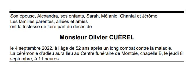 Monsieur Olivier CUÉREL 20 mai. 1970 - 05 sep. 2022 Avis mortuaire PFG Télecharger PDF Partager sur: Galerie PreviousNext PreviousNext