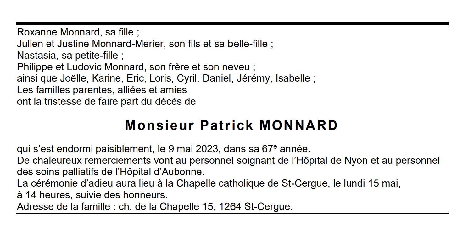 Monsieur Patrick MONNARD 03 déc. 1956 - 09 mai. 2023 Avis mortuaire PFG Télecharger PDF Partager sur: Galerie PreviousNext PreviousNext