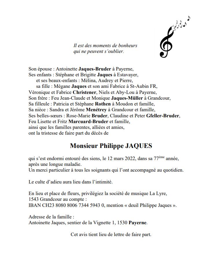 Monsieur Philippe JAQUES 15 mai. 1945 - 12 mar. 2022 Avis mortuaire PFG Télecharger PDF Partager sur: Galerie PreviousNext PreviousNext
