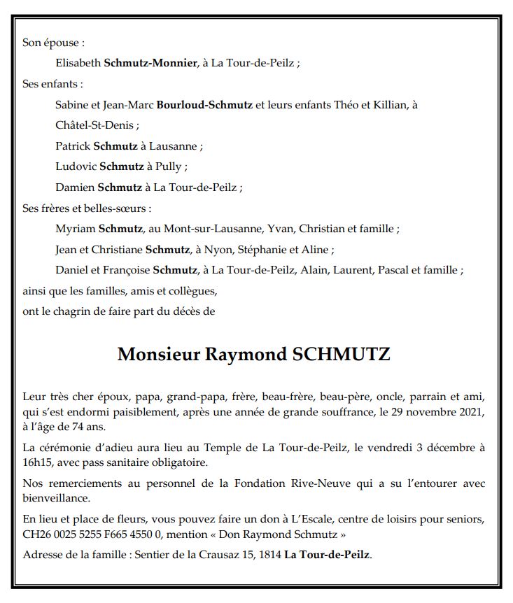 Monsieur Raymond SCHMUTZ 02 oct. 1947 - 29 nov. 2021 Avis mortuaire PFG Télecharger PDF Partager sur: Galerie PreviousNext PreviousNext