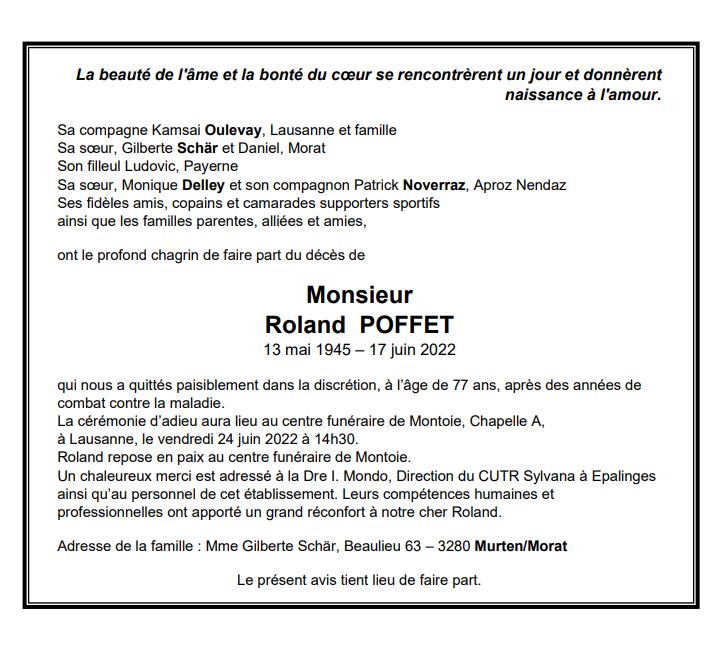 Monsieur Roland POFFET 13 mai. 1945 - 17 juin. 2022 Avis mortuaire PFG Télecharger PDF Partager sur: Galerie PreviousNext PreviousNext