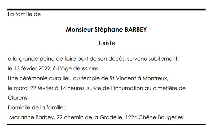 Monsieur Stéphane BARBEY 18 mar. 1957 - 13 fév. 2022 Avis mortuaire PFG Télecharger PDF Partager sur: Galerie PreviousNext PreviousNext