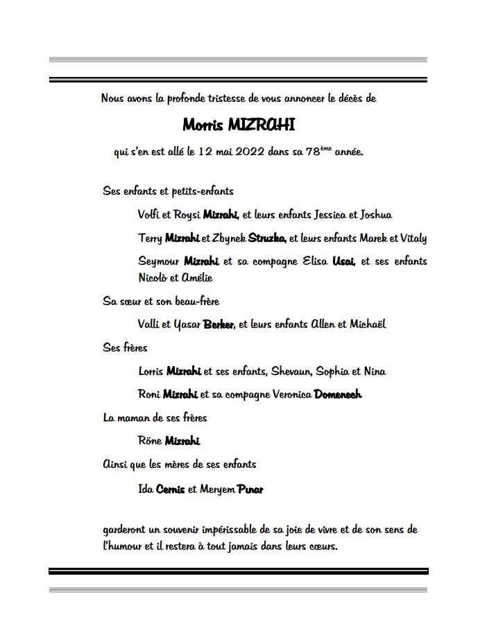 Morris MIZRAHI 03 mai. 1944 - 12 mai. 2022 Avis mortuaire PFG Télecharger PDF Partager sur: Galerie PreviousNext PreviousNext