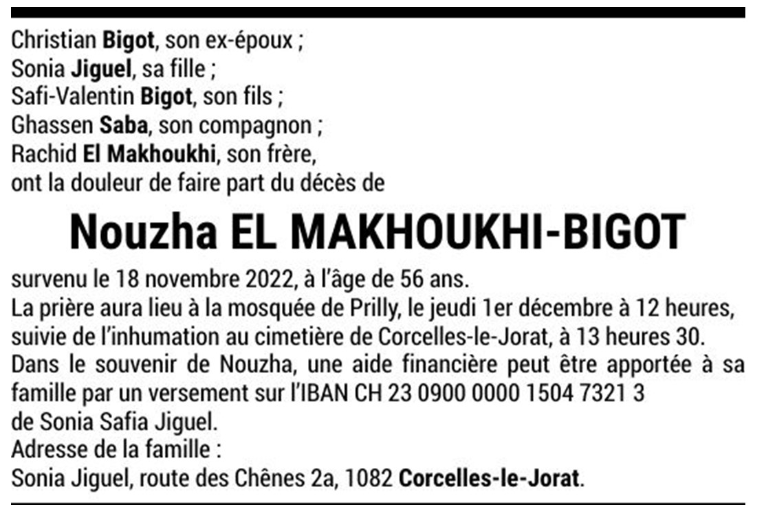 Nouzha EL MAKHOUKHI-BIGOT 13 oct. 1966 - 20 nov. 2022 Avis mortuaire PFG Télecharger PDF Partager sur: Galerie PreviousNext PreviousNext