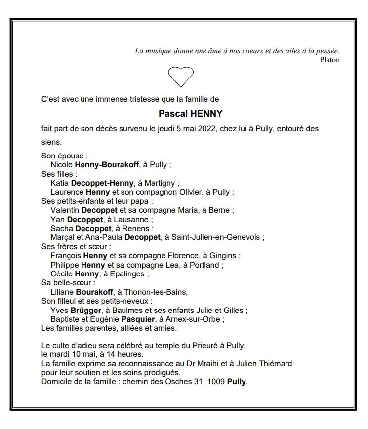 Pascal HENNY 05 mai. 2022 Avis mortuaire PFG Télecharger PDF Partager sur: Galerie PreviousNext PreviousNext