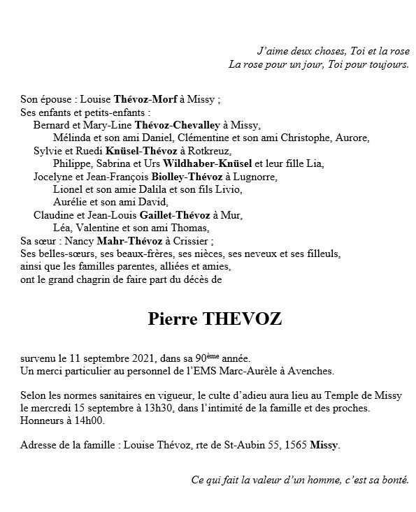 Pierre THEVOZ 01 nov. 1931 - 11 sep. 2021 Avis mortuaire PFG Télecharger PDF Partager sur: Galerie PreviousNext PreviousNext