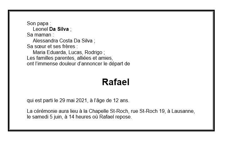 Rafael COSTA DA SILVA 12 mar. 2009 - 29 mai. 2021 Avis mortuaire PFG Télecharger PDF Partager sur: Galerie PreviousNext PreviousNext