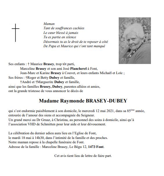 Raymonde BRASEY-DUBEY 08 nov. 1936 - 12 mai. 2021 Avis mortuaire PFG Télecharger PDF Partager sur: Galerie PreviousNext PreviousNext