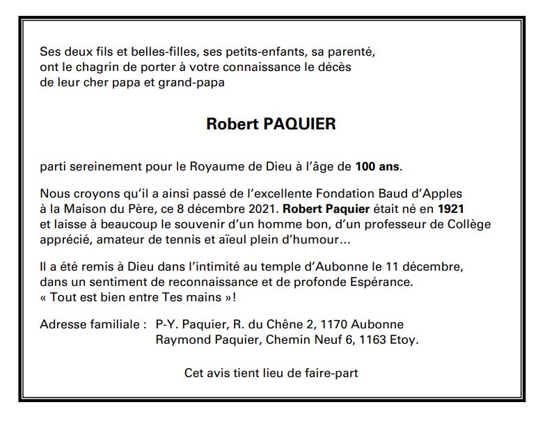 Robert PAQUIER 11 aoû. 1921 - 08 déc. 2021 Avis mortuaire PFG Télecharger PDF Partager sur: Galerie PreviousNext PreviousNext