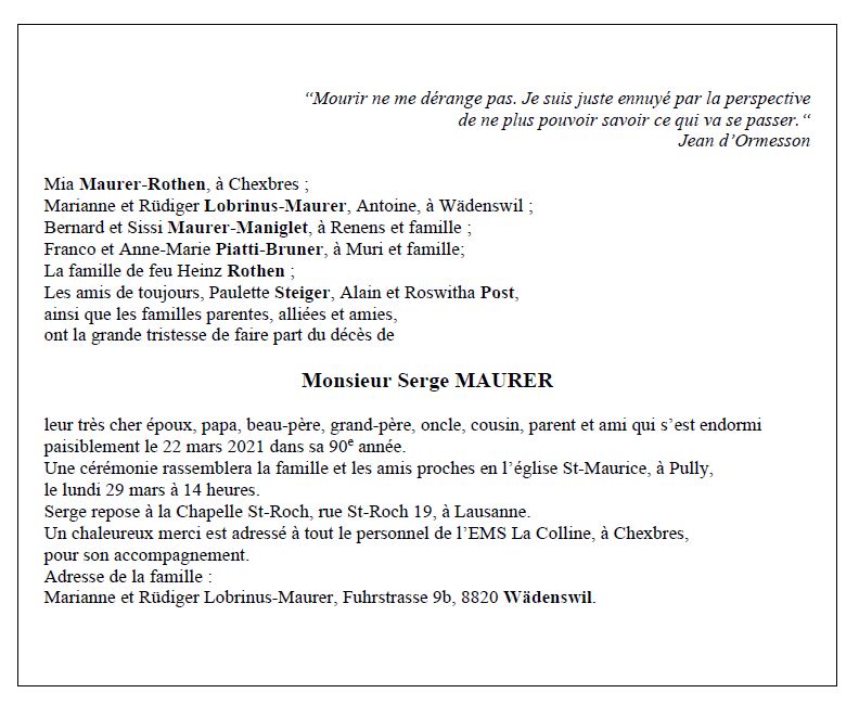 Serge MAURER 22 mar. 2021 Avis mortuaire PFG Télecharger PDF Partager sur: Galerie PreviousNext PreviousNext