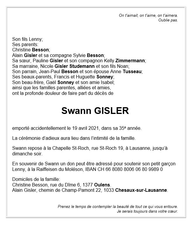 Swann GISLER 26 mar. 1986 - 19 avr. 2021 Avis mortuaire PFG Télecharger PDF Partager sur: Galerie PreviousNext PreviousNext