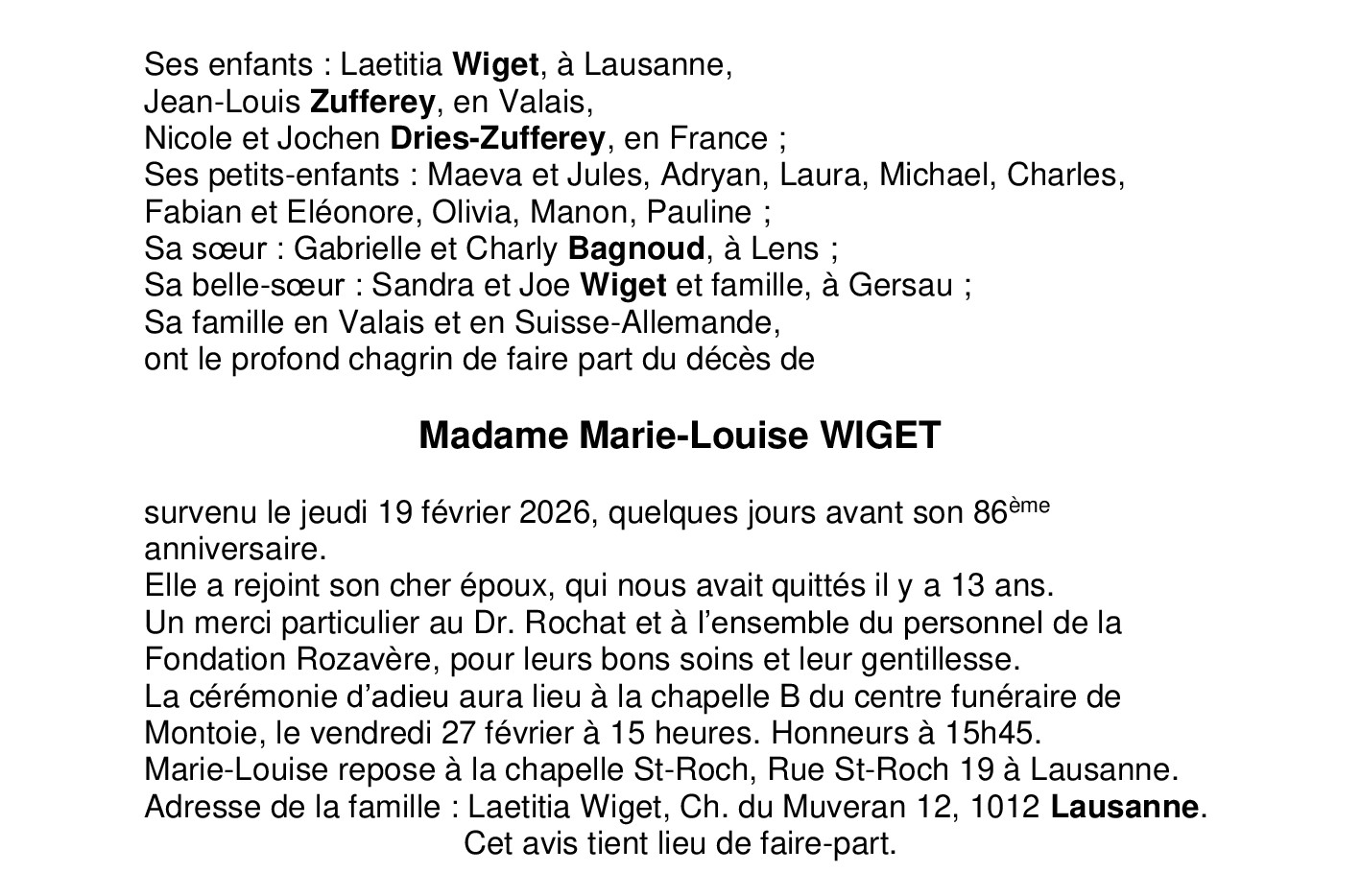 Madame Marie-Louise WIGET